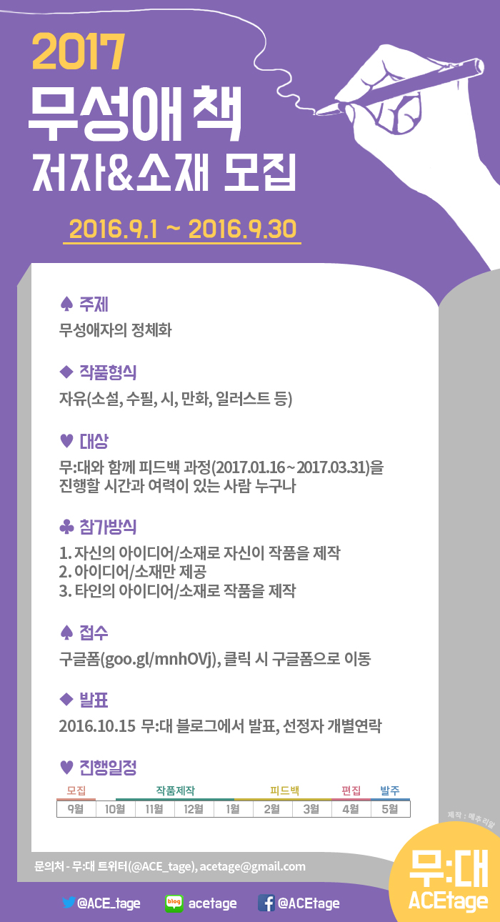 한국에서의 무성애 가시화를 위해 많은 참가를 부탁드리겠습니다. 기타 문의사항은 무:대의 공식 트위터 계정(@ACE_tage)이나 공모 담당자(010-3319-1605)에게 보내주시면 최대한 빠르게 답변드리겠습니다.