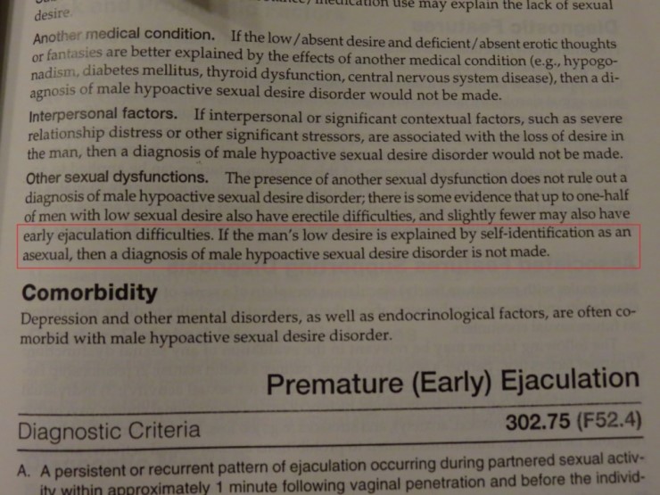•DSM의 진단참고용 탁상편람 버전에는 무성애가 없습니다: DSM은 1천 쪽의 분량, 1.5kg의 무게를 가진 괴물 같은 책입니다. 따라서 진단기준만을 담은 요약 버전이 있습니다. 안타깝게도, (여성성적관심/흥분장애와 남성저활동성성욕장애) 두 질환에 대한 진단기준 어디에도 무성애에 대한 언급은 없습니다. 무성애를 예외로 두는 부분은 해당 글의 다른 란에 위치해 있습니다. 따라서 누군가가 탁상편람에 있는 진단기준만을 본다면, 무성애에 대한 예외를 확인할 수 없습니다.