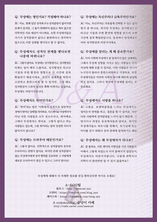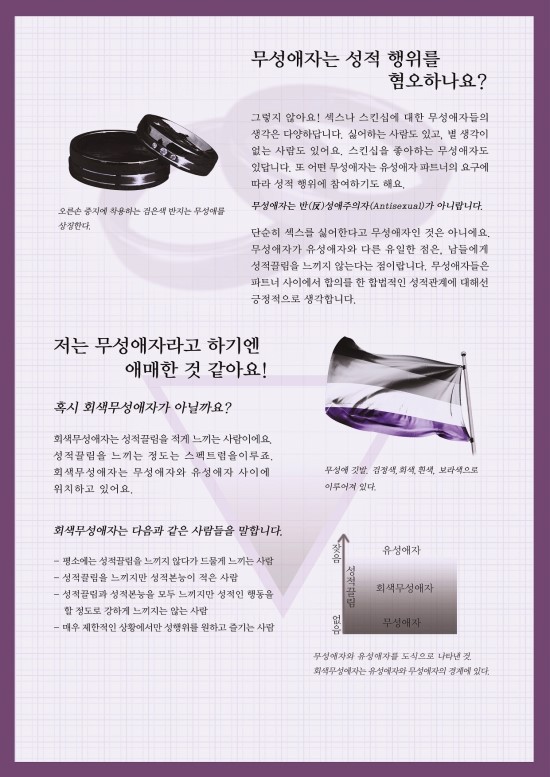 지난 2016년 퀴어퍼레이드에서 구 에이로그 팀(현 무:대)에서 배포한 무성애 팜플렛입니다. 무:대의 귤님이 만들어주셨습니다. 무성애에 대한 좋은 정보가 실려 있기 때문에 무:대 블로그에 공개합니다.