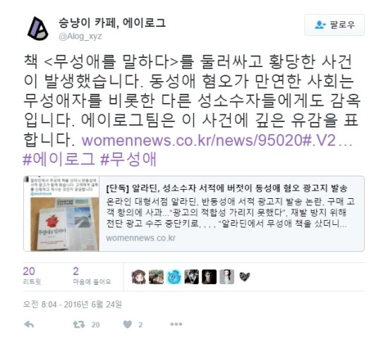 지난 6월 23일에 알라딘에서 <무성애를 말하다>를 구매한 독자가 책에 반동성애 책자가 같이 끼워져 왔다는 사실을 트위터에 폭로했습니다. 알라딘 측에서는 이에 대해 사과한 한편 재발방지를 위해 전단 광고 집행을 중단했습니다. 한편 구 에이로그 팀(현 무:대)에서는 이 사건에 대해 트위터에 공식적인 짤막한 논평을 냈습니다.