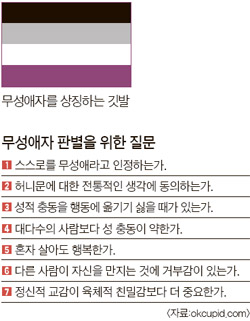 또한, 이 그림에 있는 일곱 가지 질문들은 자신이 무성애자인지 아닌지 판단하는 데에 별로 도움이 되지 못합니다. 1번을 제외한 모든 항목은 유성애자들에게도 해당됩니다. 유성애자들도 혼자 살아도 행복할 수도 있고 그렇지 않을 수도 있고, 다른 사람과의 접촉이 좋을 수도 있고 귀찮을 수도 있고, 에로스와 플라토닉 러브 중 하나만을 더 중요하게 여길 수도 있죠. 그리고 무성애자는 성적끌림(그림에서는 ‘성적충동’이라고 되어 있는데)이 없거나, 성적끌림이 적거나(즉 회색무성애자), 특수한 상황에서만 상대방에게 성적끌림이 일어납니다(즉 데미섹슈얼). 무성애자는 단순히 성적끌림이 약하거나 섹스를 하기 싫어하는 것이 아닙니다.